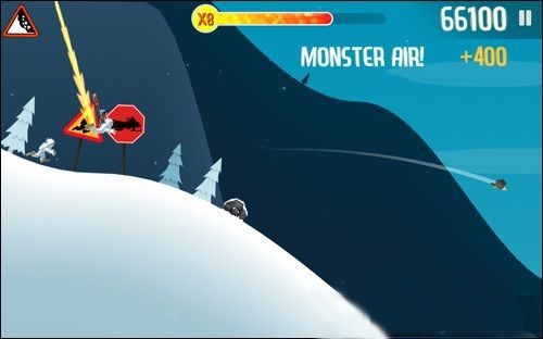 3、屏幕左侧上方的雪崩警示牌会在雪堆即将接近时不断地闪烁以示警告,即时你已经在视野中能够看到背后奔腾而来的大雪,如果此时爬起继续滑行,那么甩掉这近在咫尺的雪堆也并非不可能。