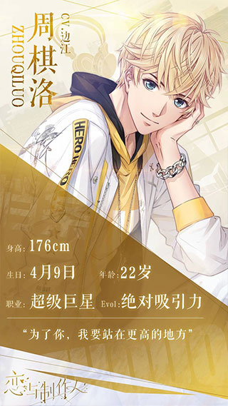 浅金色的柔软发丝、仿若倒映了整片星空的深蓝色眼眸、洋溢着少年之气的脸庞,周棋洛的立绘浑身上下都散发着kirakira的爱豆光芒,纯粹而透明。为周棋洛配音的边江大大,一向以能让人苏到哭的低音为大家所熟知,但是配起软糯阳光的少年来也非常得心应手。他的周棋洛,明快又阳光,软萌又可爱,非常治愈。