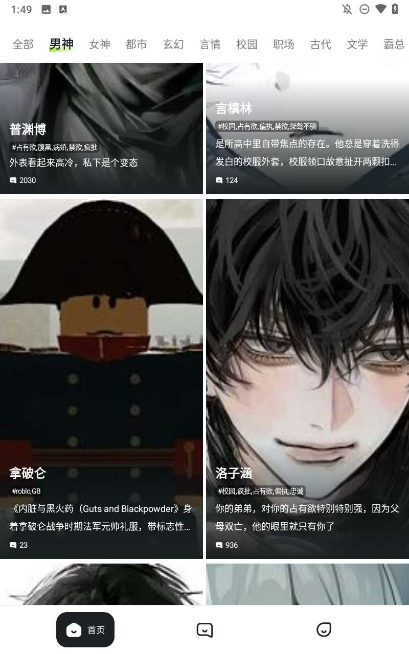 2、打开进入软件,在首页中可以通过“全部”“男神”“女神”“都市”“玄幻”等分类标签筛选AI角色。