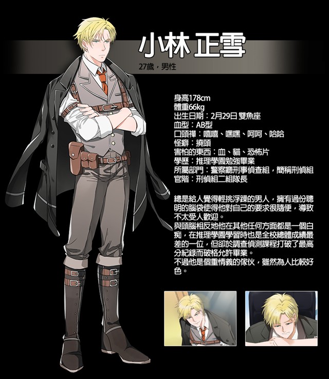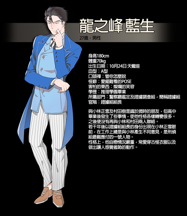 与小林正雪及村田树是识于微时的朋友,但高中毕业后发生了些事情,使他性格各样转变很多。之后便再也没有与小林和村田两人联络。若干年后以证据组组长的身份出现在小林正雪眼前,在工作上总是与小林产生不同意见,是刑侦组最难应付的一号人物。性格上,他自恋情况严重,常爱穿古怪衣服以及做出让人感觉羞耻的动作。