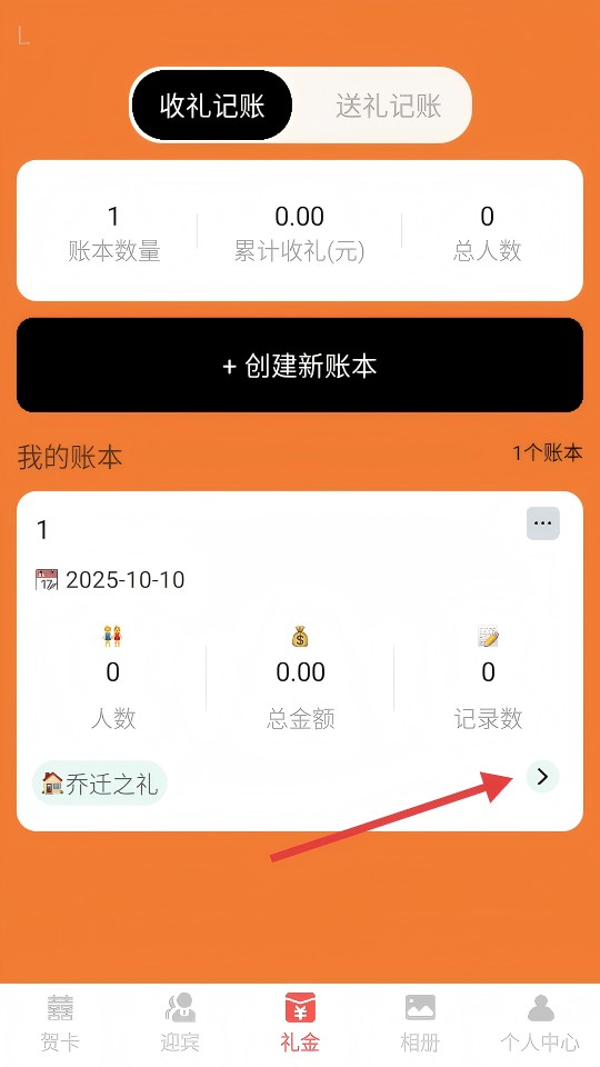 2、在礼金页面的我的账本区域,点击【乔迁之礼】右侧的箭头,进入收礼记录页面。