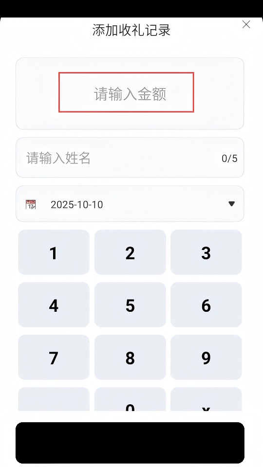 4、在【添加收礼记录】页面,输入【金额】、姓名等信息,完成收礼记录添加。