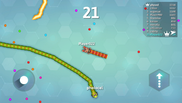1、控制摇杆走位你的小蛇,吃掉地图上彩色的小圆点,就会变长哦。