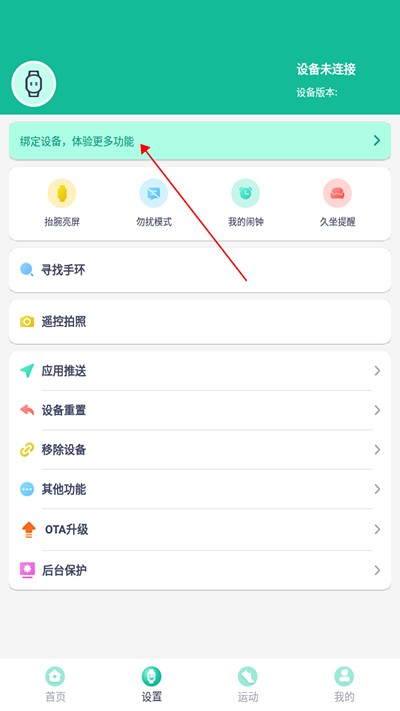 1、首先打开FitPro,然后通过底部菜单栏进入设置页面,确保自己的手环蓝牙开启,然后点击页面中的绑定设备选项