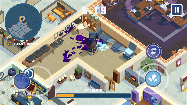 1、玩家可以使用水管等工具来进行清理象是咖啡机爆炸的残骸、油漆飞溅的地板或脏兮兮的马桶等,随着阶段的推进会拥有更多清洁工具让Kyle使用。