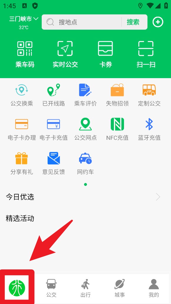 1. 打开应用进入首页,点击底部菜单的绿色树叶图标,可快速访问乘车码、实时公交、卡券等功能。