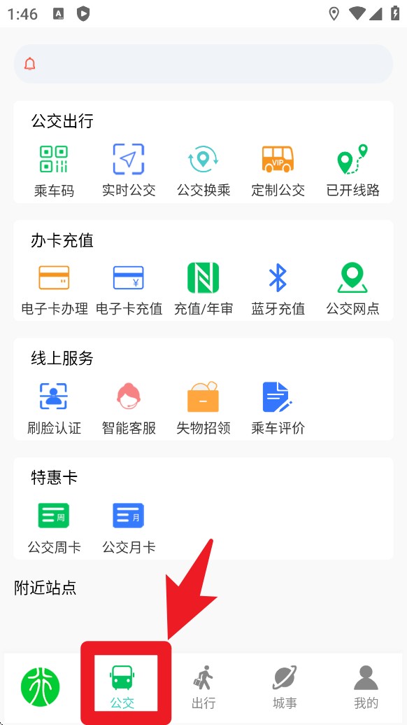 2. 点击底部导航的“公交”选项,即可查看公交出行服务,支持乘车码、公交换乘、电子卡充值等功能。