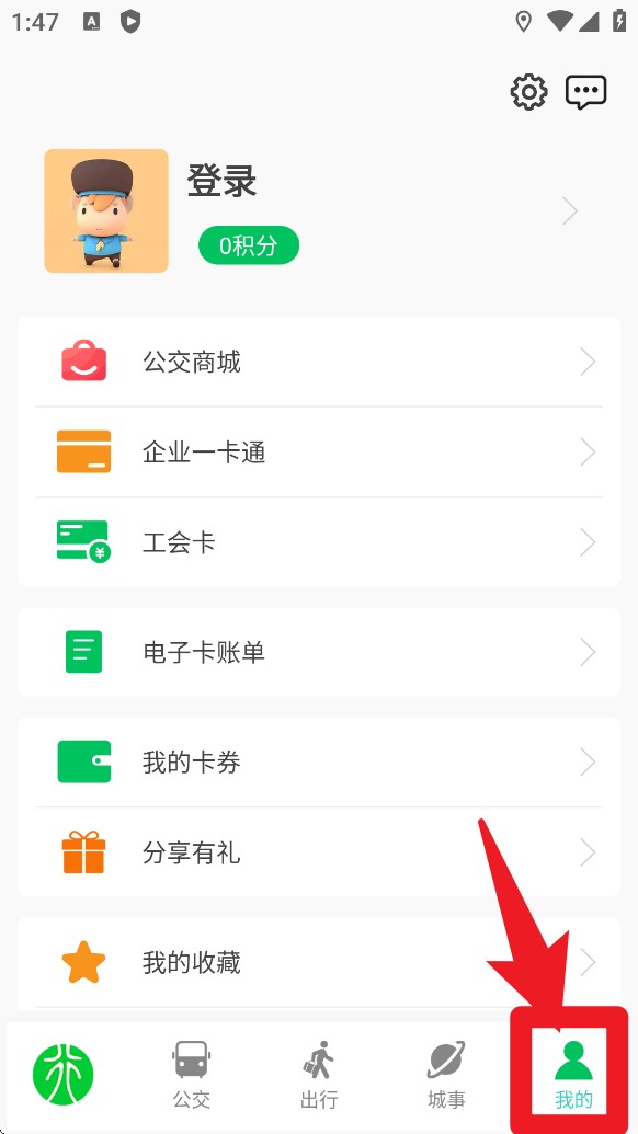 4. 进入“我的”页面,可查看个人信息、卡券、账单及收藏,同时还能进入公交商城与享受积分服务。