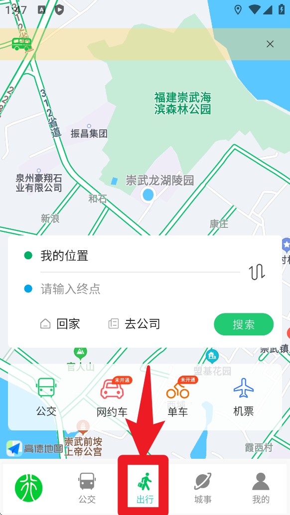 3. 在底部选择“出行”,输入起点与终点后点击搜索,可获得公交、网约车或骑行等多样出行方案。