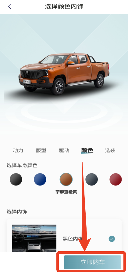 7、车身的颜色也有很多种,不过内饰可能就只有一种。全部选择完毕后点击左下角的【立即购车】。