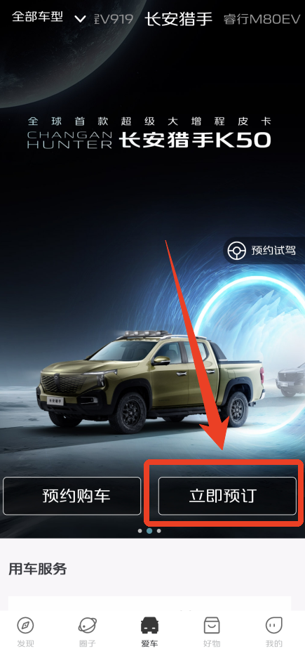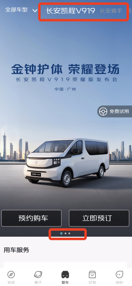 1、登录之后点击下方中间的【爱车】,你先左右滑动选择想要预定的车辆,有长安凯程V919、长安猎手以及睿行MBOEV。其中长安凯程V919支持免费试用哦!