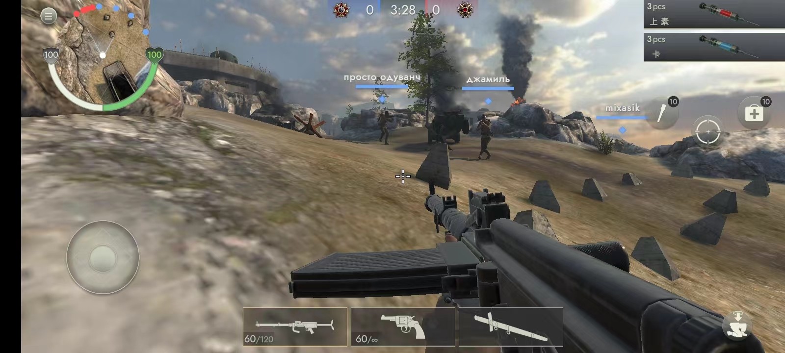 4、游戏分为两个阵营,红方和蓝方,比如说下图,玩家所处的阵营是蓝方,需要与队友合作攻打别人;红方则是你的敌人;左边的按钮控制人物的移动;