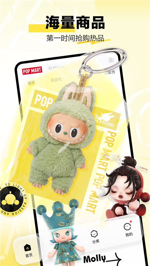 1、打开App首页,点击“商品”或“新品”栏目,选择喜欢的系列(如SKULLPANDA、DIMOO等)。