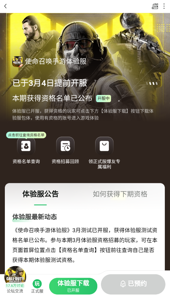 使命召唤手游体验服是《使命召唤手游》官方对外开放的体验服,体验服中主要目的是为使命召唤手游提前上线游戏玩法,在体验服中,你能体验到最新的更新情况,如新地图、新枪械、新玩法模式、游戏调整等,除此之外,在体验服中,更是有着很多福利等你领取,感兴趣的快来下载安装吧~