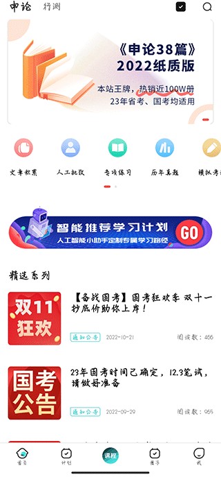 3、课程界面有申论和行测的多种学习课程,例如纸质版教程,基础知识,进阶攻略等