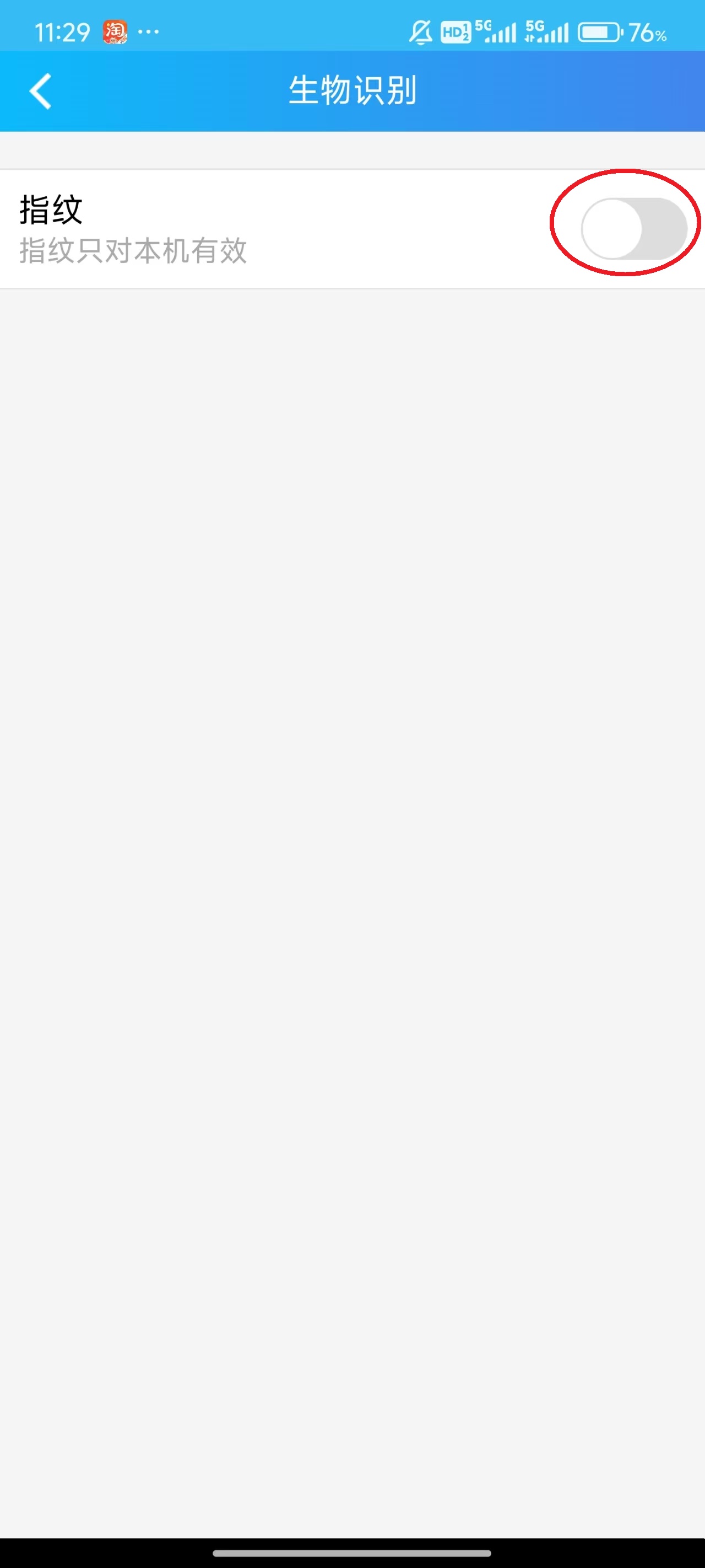 4、点击“指纹”右侧的“开关键”,开启该项。