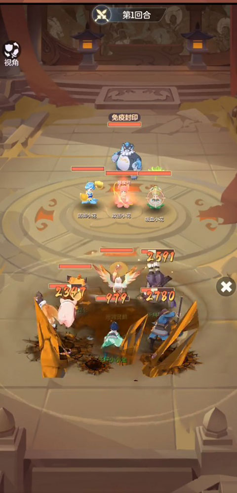 2、第2-3回合优先集火攻击小花,点杀成功后就可以准备集火暴食熊。灵鹤倒地后,带有闪现的灵狐出场,因其速度比较快,可以给他人喂药,来保持我方单位的站场能力。
