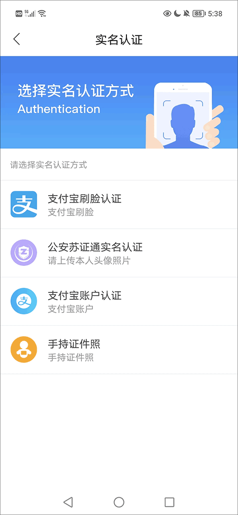 3、然后,用户需要在实名认证界面通过选择四种方式中的一种认证方式进行认证;