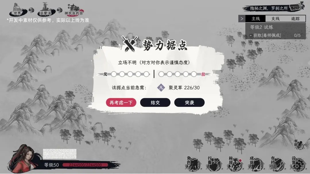 与其他势力的互动有两种选择:“结交”或“攻打”。若选择攻打,少侠将最多携带3名弟子协同作战,可选择亲自战斗或制定策略领导弟子参与侠客对决。若与某势力“彻底结交”或“彻底打服”,其每日将向少侠进贡资源,且可能附赠势力中的“高手”加入。通过宗门内的“江湖版图”模块,可实时查看与各势力的结交/攻打进度。