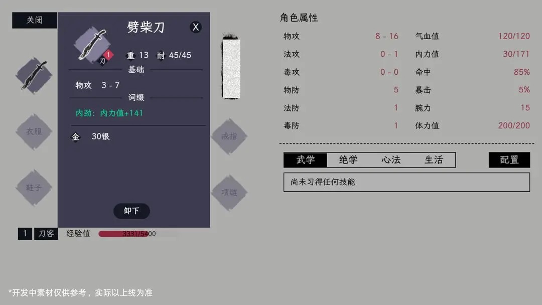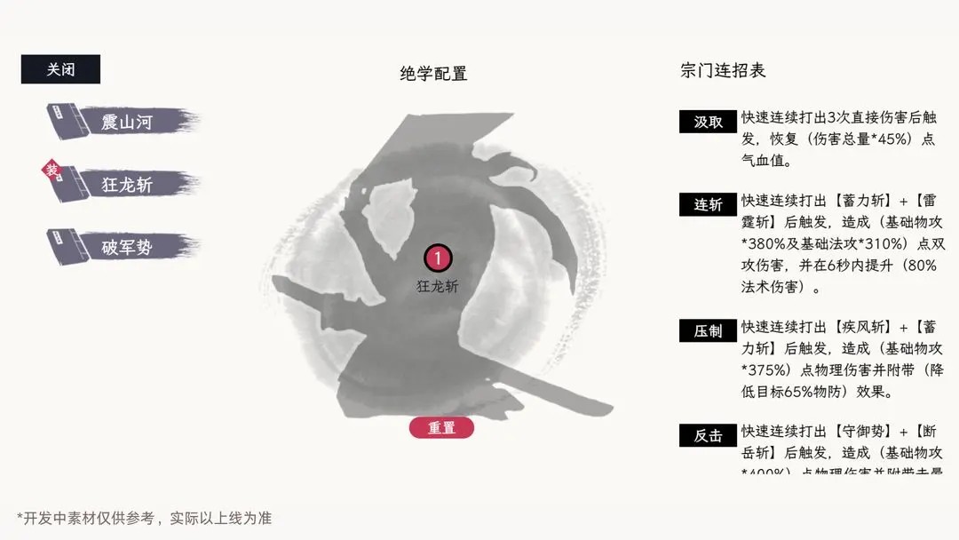 少侠可通过技能书习得门派专属技能,每种职业可习得7个基础武学以及3个门派绝学以及35个门派心法,同时,少侠可以配置4个技能以及1个绝学用于战斗。不同的基础武学配置,会产生不同的连招效果。(此处以刀客为例)