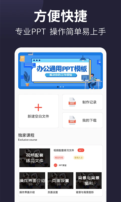 PPT制作是一款专业的制作ppt工作软件,用户能够充分发挥出自己的创意制作ppt,海量精美的PPT模板,涵盖了多个使用场景,比如企业宣传、求职应聘、工作总结等,还拥有超多课程资源,通过软件就能高效创作PPT了,支持用户查找精美的模板,运用模板就能一键生成同款PPT,用户可以刷新推送的模板资源,定义编辑PPT进行创作,提高用户的工作效率。