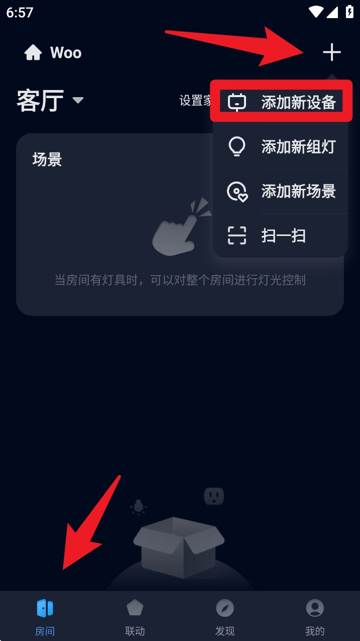 5. 返回房间首页后,点击右上角的「+」号图标,选择「添加新设备」开始连接你的智能家居硬件。