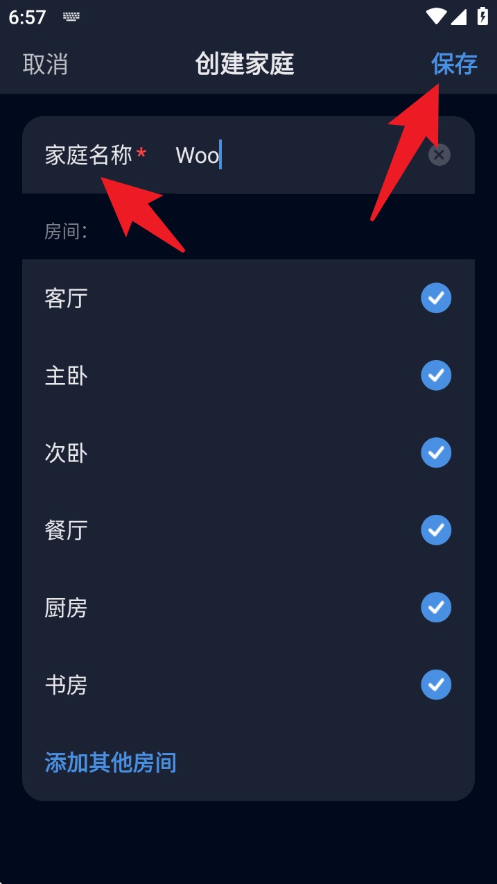 4. 填写好家庭名称,例如「Woo」,可勾选客厅、卧室等房间,设置完成后点击右上角「保存」提交。