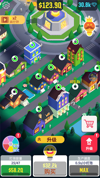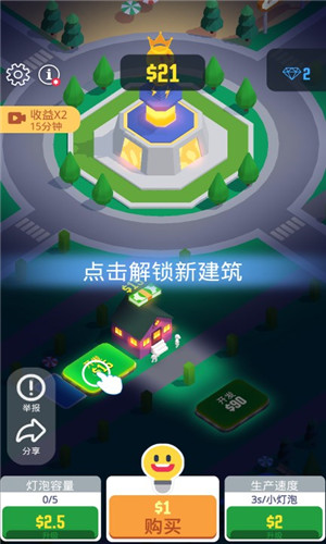 2、通过升级灯泡王国来获得更多的小灯泡,建造各种建筑物来收获新的收益;