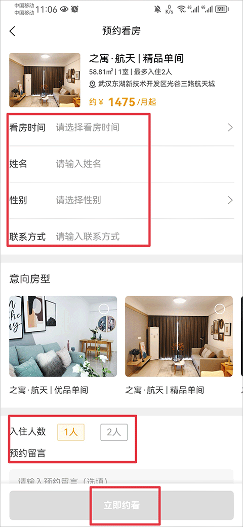 3、预约看房:将看房时间、姓名、性别、联系方式、入住人数填写完成后点击立即约看,然后等待客户经理联系你看房即可