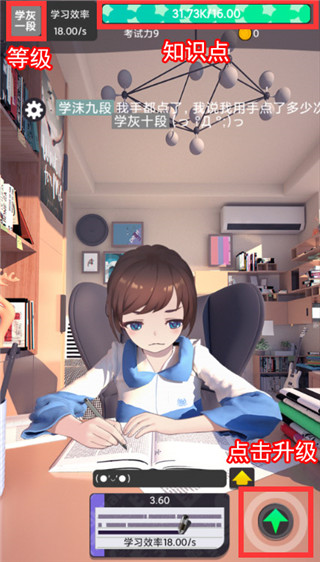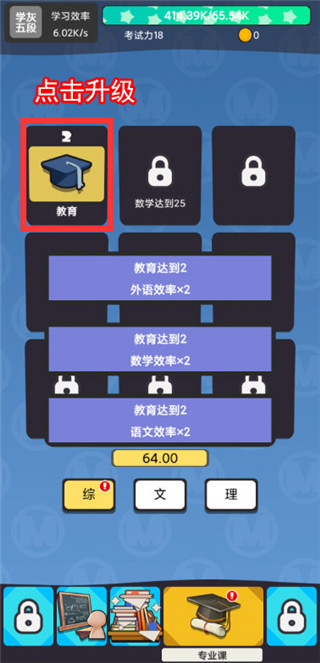 我们打开游戏后,点击右边的绿色箭头,可以增加上面进度条(知识点)的上限并提升等级,点击第二次后,就能解锁新系统‘文化课’、‘考试’和‘专业课’了。