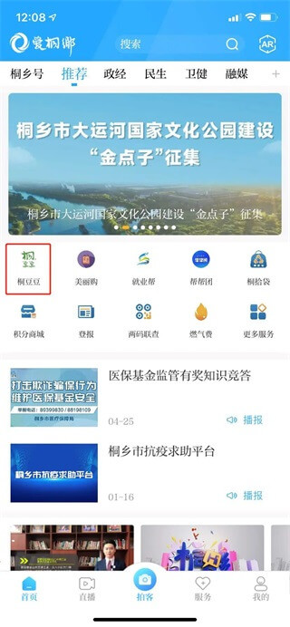 1、进入爱桐乡APP,点击首页“桐豆豆”栏目,进入该应用;