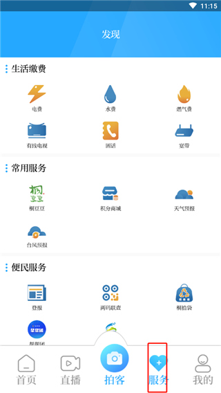 4、划分不同的发现服务版块,这里有热门活动、生活缴费以及自然天气等服务版块。