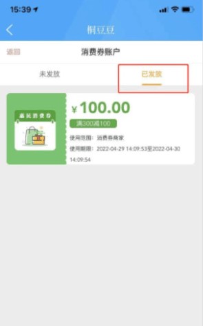 1、在“消费券账户”,点击“已发放”栏,点击需要使用的消费券,生成二维码;