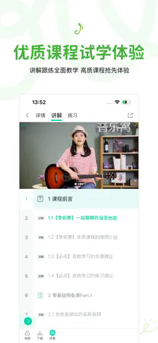 3、高质量的课程内容:高清示范/讲解/跟练视频、伴奏、乐谱