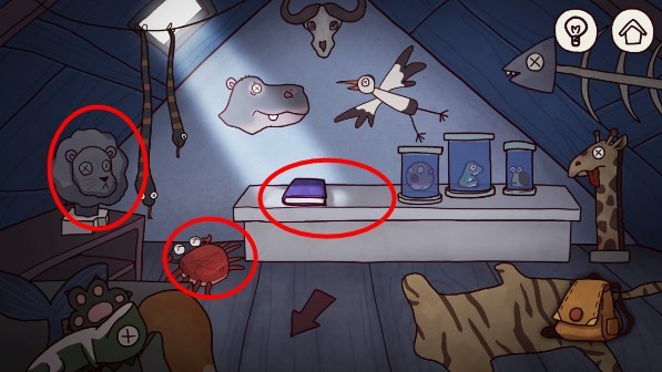 18、点击书本,一直点到最后一页获得纸张,点击螃蟹,通过面上剪头的方向按顺序点击螃蟹腿,即可打开。密码(从上往下): 左4,右2,左1,右4,左3,右1,左2,右3,获得蓝水晶,点击狮子雕像,获得者狮子雕像