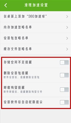 五、还可以依据个人需求,开启所需要的提醒,“存储空间不足提醒、删除安装包提醒、卸载残留提醒、安装软件后自启权限提示”。这些提醒都是默认关闭的。