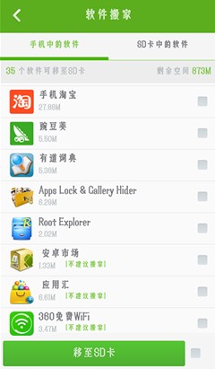 二、软件搬家功能,可以分别对手机中的软件及SD卡中的软件进行选择