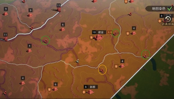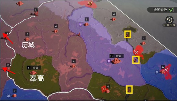 勾选右上角“地图染色”会以不同的颜色显示各同盟的占领范围。