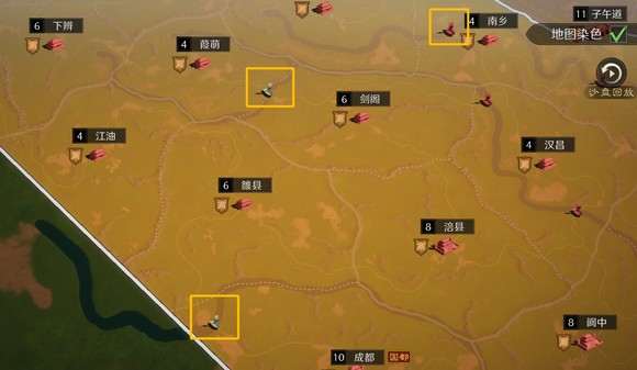 接下来我们谈谈益州的州内战争布局。首先如果想将益州一分为二,需要先行占领图中的三个黄色码头,而最下面的黄色码头是连接州府成都的建筑,因此优先级格外重要。然而,由于益州的地理环境,即使我占领了这三个码头,但散关(雍州资源州关口)却没能实现闭环,没有办法将敌军消灭在出生州之内(没有办法,如果我们设想凉州为敌荆州为友的话,散关距离凉州太近了,且资源州还在凉州一侧,如果我是益州指挥且两方实力均衡的情况下,散关将会成为我的弃子。但这并不影响我对大战略的布局,因为成都真的太重要了,益州是一个非常适合打逆风的出生州,通过第二张图我们可以看到,如果想守成都,那德阳也将会是我不能放弃的一座城,我们把成都和德阳看做一体,那连接这两座城市的道路将只有两个码头(意味着在没有友盟设定的情况下,只有两个敌盟会与我接触)。州府的居民容量是45人,德阳35人,如果我能吸纳80人的盟内高战并命令外围盟友进行袭扰,会给敌军造成很大困扰。(终测出生州BUFF取消了,如果在浪花测试,这样的布局近乎铁桶)。因此益州的开局优先级为:下方黄色码头>西城>德阳。(这样的布局是基于常规化的友荆敌凉,战场态势会随意变化,如果是相反状况,有机会我们再另行分析)。