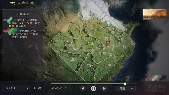 右上角“沙盘回放”会记录区服每天发生的事件,如同盟攻占城池、抽卡欧皇等。