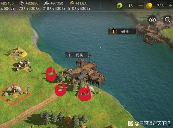 这里有一个关于码头的小技巧,新玩家可能不太了解,有些散人兄弟新手期更倾向发育,对指挥的布局参与积极性不高这也是难免的,所以游戏机制中,开局如果在战略码头的其中一侧如果建有三个营帐(至少),也可以达到阻止对方调动、行军的目的,这项任务通常需要码头周边的盟友来执行,因为在没有调动城市的情况下(过远的行军掉补给),他的位置更适合驻守以防止被拆。