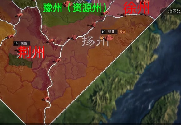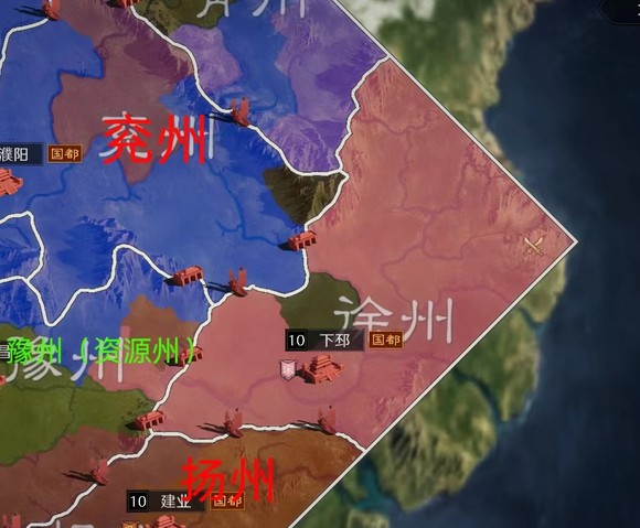 最后一个出生州-徐州,治所郯县,在今山东郯城县。东汉末年移治下邳,在今江苏邳州。三国曹魏移治彭城,即今江苏徐州。辖境相当于今江苏长江以北及山东南部地区。在东汉末年,徐州可以说是兵家必争之地,比如陶谦、曹操、吕布、刘备等诸侯曾在徐州交锋。不过在游戏中,徐州在大战略中并不适合被动防守,而是主动出击。首先,徐州的天然盟友是扬州,是因为徐州南部(包括州府)距离兖州、扬州、资源州都比较近,在调动布局上占有先天优势(适合快速机动转移战场),但因为双关口辐射豫州的情况下,如果与扬州在资源州开战将会存在友军撞车的情况,除非在出生关口发动战争。但如果盟扬敌兖效果就不一样了。首先是兖州的资源州关口距离徐州资源州过近,且徐州拥有双关口(双关口意味着整合后的战场宽度),因此徐州很容易将兖州堵在出生州内,其次是青徐没有关口,从地图上可以看到,徐州战略纵深极大,一个拥有广袤大后方的出生州所爆发出来的战斗意志是不可估量的。