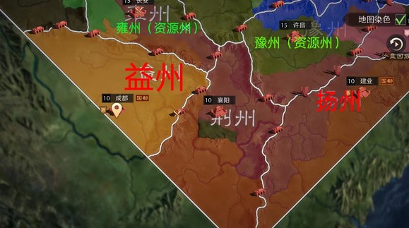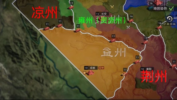 益州治所雒县,在今四川广汉。汉末移治成都,游戏中也设定为成都。辖境相当于今四川、重庆、云南、贵州大部,及陕西、甘肃、湖北的一小部分。益州是我非常喜欢的出生州,和凉州产生了鲜明的对比。当然,谈到益州就不能不提荆州,并不是因为想继承皇叔之志,而是因为在游戏大战略里,荆州的态度会对益州会产生极大影响。首先,荆州可以作为益州天然的屏障,就算没有结盟也不该对立。其一是因为益州州府成都的位置距离凉州较远,且易守难攻(具体有多容易我下一段再谈),其次是因为荆州拥有双资源州关口,在沟通(分赃)的时候更容易取得进展。其三是因为雍州的双关口与凉州的双关口可以对其造成极大威胁。(凉州内战之时,亲率益州子弟兵,入凉调停!),因此益州相对于其他出生州而言,是比较适合散人整编的,前期厚积薄发,后期一鸣惊人(当然荆州的态度至关重要)。