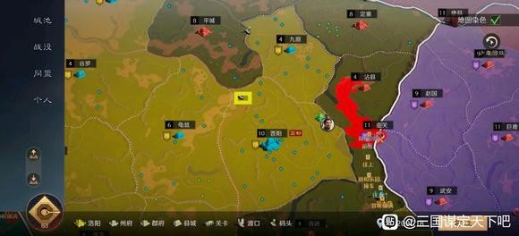 我们以兖州码头为例,如果我是兖州散人盟指挥,首先我会让队员占领图中黄色标记码头,如果有幸占领以上三个码头,码头以北的全部城市将尽数归于我手(如果我盟的意向是北进冀州),南部城市的敌军将无法通过码头进行调动,而北方的少部分敌军将会被我全盟主力分别打飞,黄河以北将再无战事。