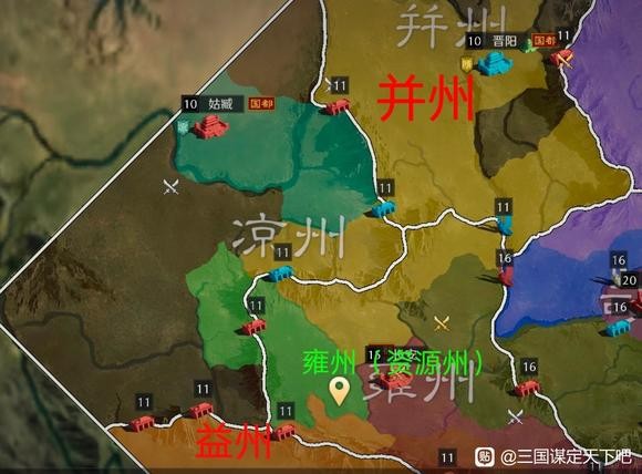 接下来分析一下并州开局,并州州府晋阳位于并州中心,西侧与龟兹接壤,北侧与九原接壤(战略优先级)且州府与两个资源州关口的距离相对较远,这也诠释了三谋的游戏特性,对于指挥的临场指挥考验更大,因为一旦我方在州府战斗之中取得胜利,那么敌军完全可以放弃州府争夺转而布局资源关口,东侧沾县连接壶关(冀州),南侧平阳连接龙门渡(雍州)。也就是说,在并州的战斗,州府的优先级要较次于其他出生州的州府,因为在大战略的背景下(比如我方需要进冀州驰援),一旦敌军在州府失利的前提下提前布局关口,极大可能会使我方被迫战略转移,在两方势力均衡的情况下强攻将会损失进入资源州的最佳时机。因此并州的关口城市就显得更为重要了。并州城市优先级:沾县=平阳>龟兹=九原