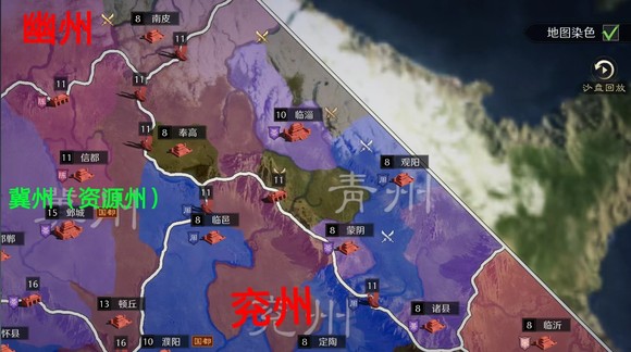 幽州,州府在蓟县,辖境相当于今北京市、河北北部、辽宁大部。东汉末年,刘备的同学公孙瓒曾割据在幽州等地。幽州在游戏中算是一个掌握地利的出生州了,其位置在于地缘最北方,且有两个资源州关口接壤冀州(资源州),幽州还有一个优势就是其一旦进入冀州,对于其后续进入司隶也有着铺地更近的优势,无论是唐县-真定-巨鹿-邯郸一线,还是易城-安国-信都-馆陶-顿丘。如果幽州能够在资源州开关前完成整合,那么两盟齐头并进一路向南的态势将会让我重见1939年9月的那场荣光。