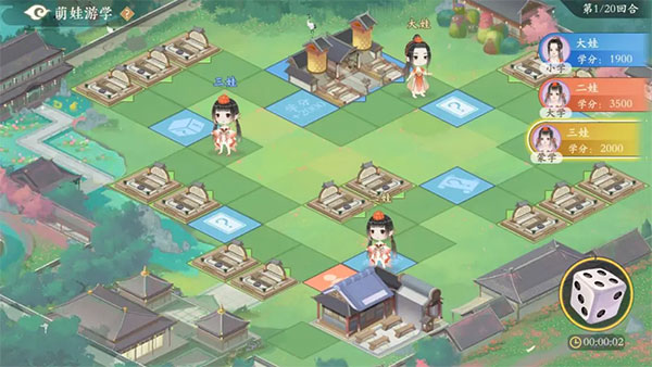 3)游学过程中,君卿需要在自己萌娃的行动回合内投掷骰子,使用道具卡,成立或者升级学习室,来尽力为萌娃获得更多学分;