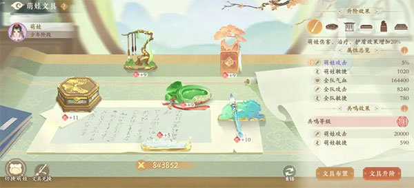 3)布置文具的品质和数量满足条件时,即可激活和升级文具共鸣,获得额外的属性提升;