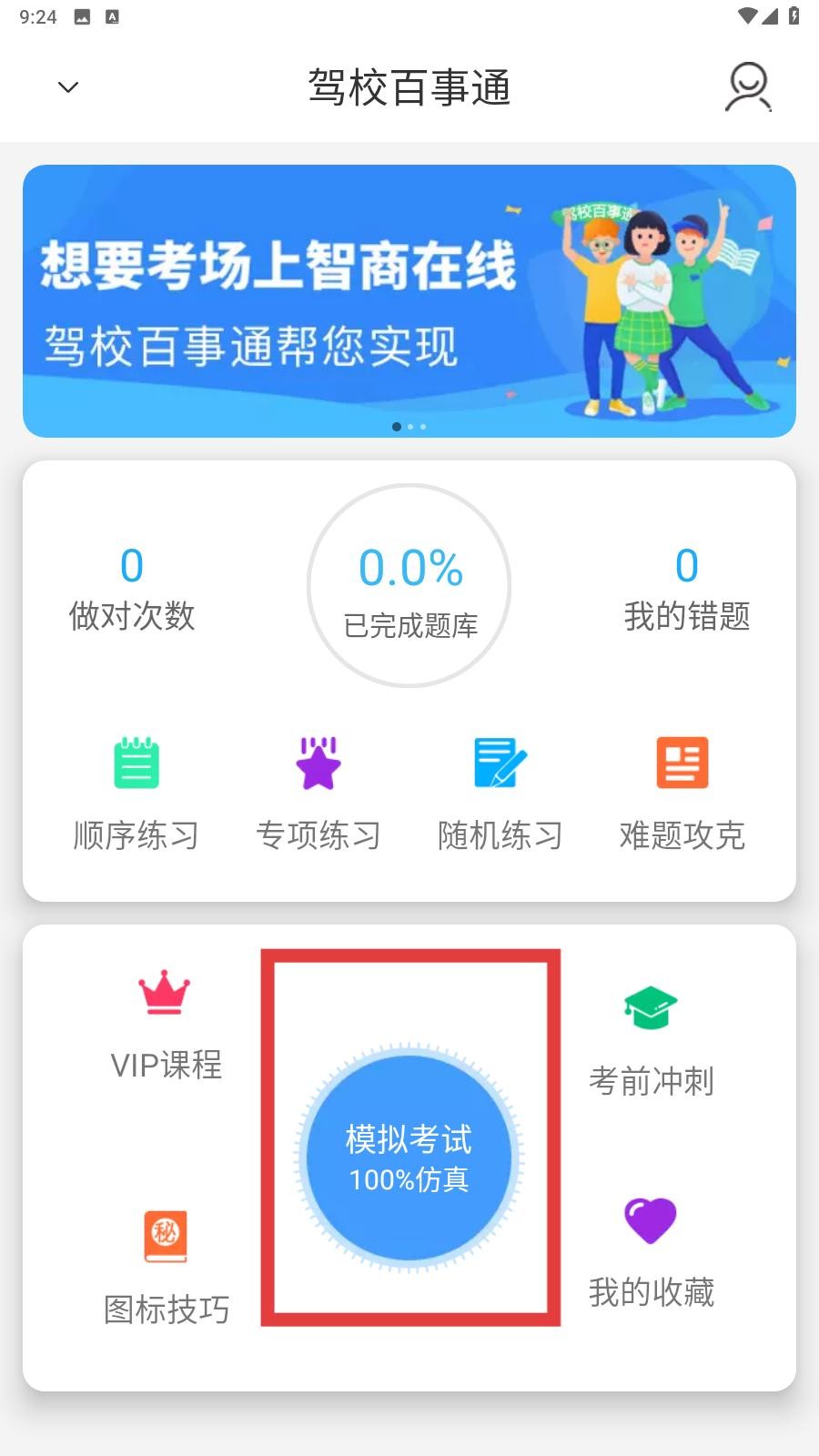2、来到主页面,可以看见有许多功能,跟随小编的方框查看,点击模拟考试,即可进行下一步。