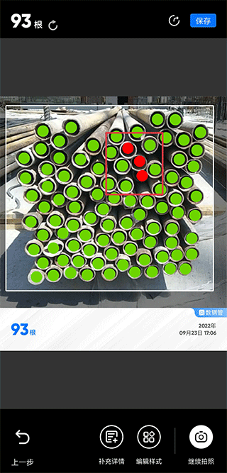 4、若出现有漏数的情况,用户还可以在图片中点击漏数的钢管,手动点的以红色出现,同时点击后下方数字会自动增加